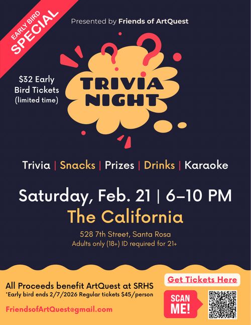 Friends of ArtQuest, our non-profit organization that supports all things ArtQuest, is hosting its 1st Annual Trivia Night! This FUNdraiser is sure to delight. An evening of friendly competition, snacks, drinks, karaoke, prizes and a lot of laughs! This is for people 21 and over. Build your team, or come alone and join a lucky team. Either way, do not miss this great opportunity to have a good time and support the arts in your community.